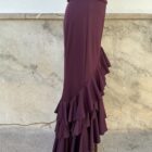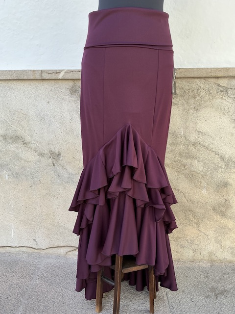 Falda taconeo esta falda de baile flamenco de cintura alta es el nuevo modelo taconeo está confeccionado en punto elástico, cuenta con una cintura alta doble que en talla. La permisión es en tallada desde la cadera hasta la rodillaEl modelo taconeo cuenta con una apertura en la parte delantera, formada por tres volantes en cascada que crean una subida de pico. La la falda queda más corta por delante y mantenga el largo original por detrás cuenta con un diseño muy elegante y estiliza la figura femenina