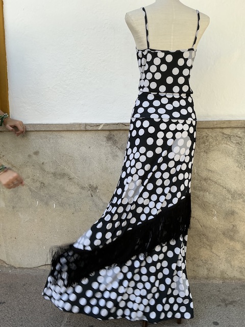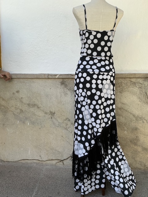 Conjuto bulería con lunares falda con cintura alta, top de tirantes finos , especial para el flamenco . La mejor característica de esta falda es su vuelo y su diseño de fleco